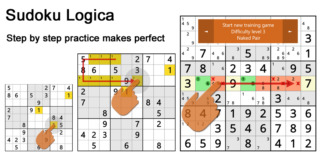 The operation of Sudoku Logica is very simple and it is suitable for beginners as well as for professionals because of the four help levels, the eleven difficulty levels, the explanatory help and the 40 strategies of the training games.